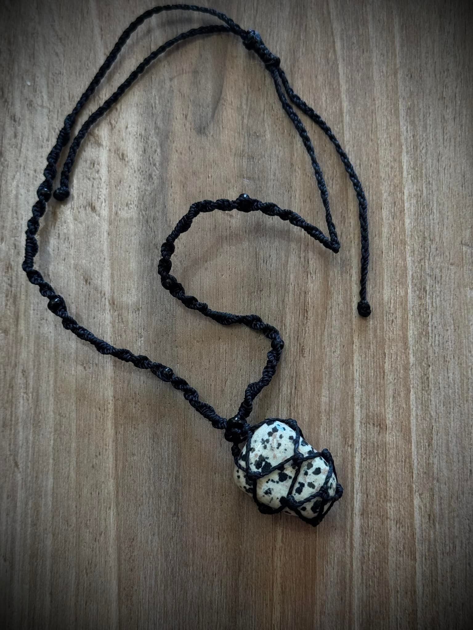 Discover the allure of this exquisitely handcrafted micro macrame necklace, adorned with a captivating tumbled Dalmatian Stone. With its adjustable length, this necklace is intricately wrapped in luxurious Peruvian waxed thread, offering both style and versatility.